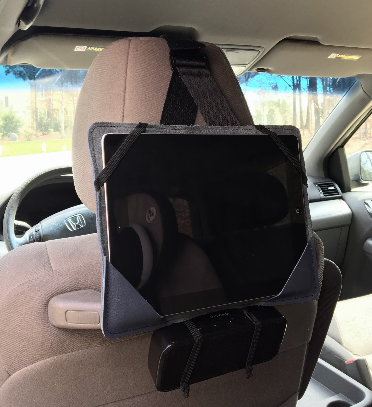 I remembered the day before we were to go on a road trip to the Smokey Mountains last week that our plastic iPad mount was broken. I got supplies together I had on-hand and came up with an easy, yet very effective headrest mount that I’d like to share with you (so you can make one too)!