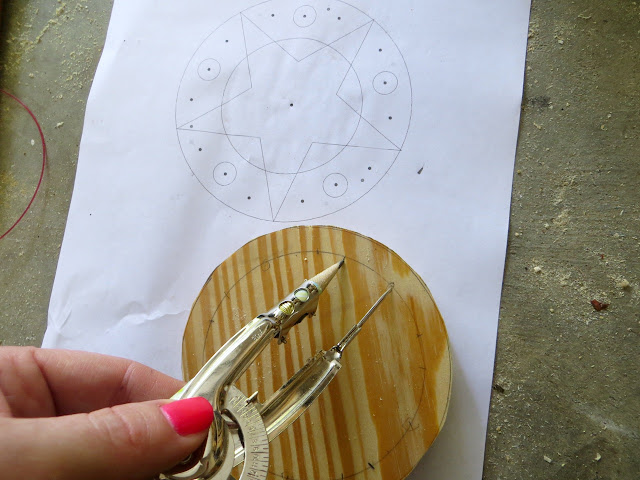 Use your compass again to measure the distance for your chime placements and transfer to the inner circle on your circle block. These points don’t particularly matter to me except they acted as measuring points where to mark the hanging points from. I measured from the ‘chime placement’ marks and on each side placed a mark where I wanted to drill for my strings to run through. TIP: circle your ‘chime placement’ marks so you don’t confuse them with your ‘string placement’ marks. Drill holes for strings.