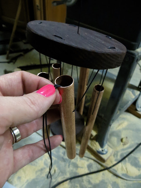 I hung the hanging plate through the center hole with my waxed cord, knotted a few times underneath the ‘plate’ and attached the striker block with a few knots under that as well. Although I didn’t have eye hooks, I think I still prefer the knots anyways. Next I hung my chimes using a continuous cord and knotted the final knot inside one of the chimes so it wouldn’t be visible.