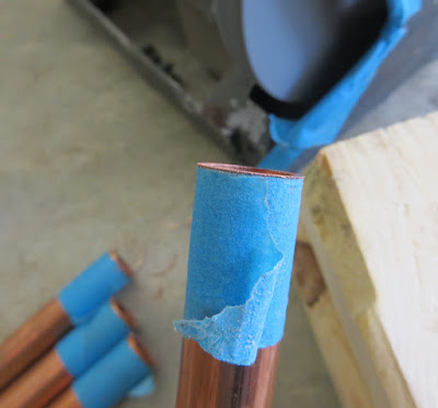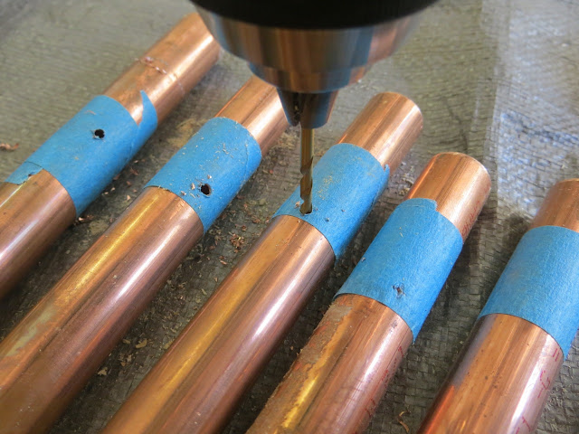 …pulled it off and smashed the paper tube flat and mark each fold. Slide the paper back on your pipe, line up one of the marks on the paper with your first mark on the tube – your last hole will be indicated on the paper – transfer to pipe. That was easy! I used the same paper for marking the rest of my tubes.