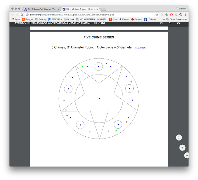 Once you open the document you find the right template by how many chimes you’re doing and their diameter. Make sure your printing settings are set to ‘no page scaling’ or ‘scale to 100%’. I had 5 chimes at 1/2″ diameter so my template was on page 13.