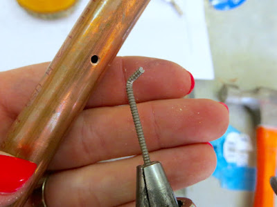 I first hammered a nail gently over my marks to dent the tape a little so my bit wouldn’t slide around. I used a metal drill bit to drill carefully. Copper is soft and it cuts really easy!
