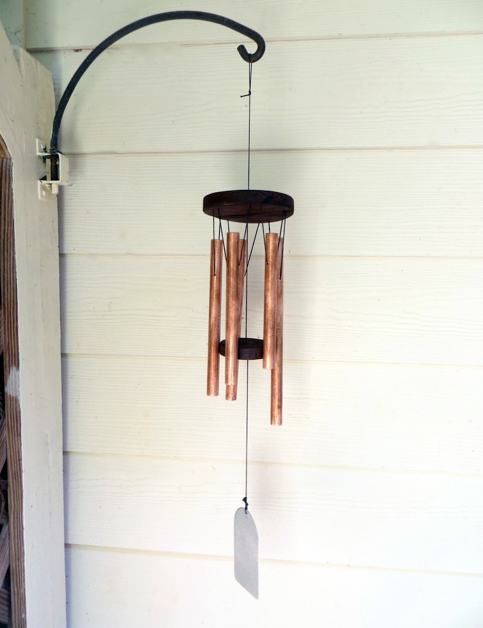 I hung the hanging plate through the center hole with my waxed cord, knotted a few times underneath the ‘plate’ and attached the striker block with a few knots under that as well. Although I didn’t have eye hooks, I think I still prefer the knots anyways. Next I hung my chimes using a continuous cord and knotted the final knot inside one of the chimes so it wouldn’t be visible.