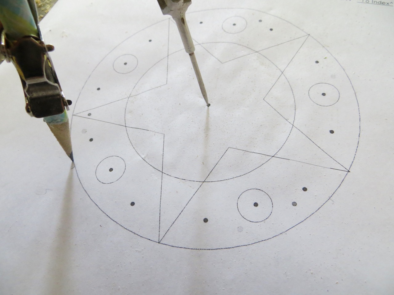 Use your circle compass to find the diameter for the outer circle (hanging plate/support disk)…