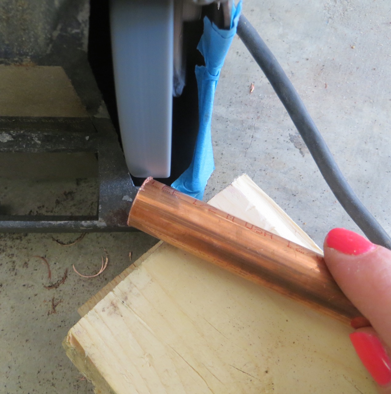 I measured from the clean-straight edge to mark my other ends with the precise length. I used painter’s tape to mark around the entire pipe at that mark. This gave me a defined line to grind up to on all sides.