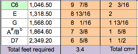 If you notice on the spreadsheet there are 7 green highlighted boxes which are different notes/tunes you can choose between. I don’t know much about tones/notes but you’ll see that C1 has the longest size tubes starting around 55″ which would give you a very low sounding chime (right?) and the total amount of pipe you’d need for that set is 19.2 feet! I only had 4 feet to work with so that meant the largest chime I could make was from C6 (3.4 feet needed).
