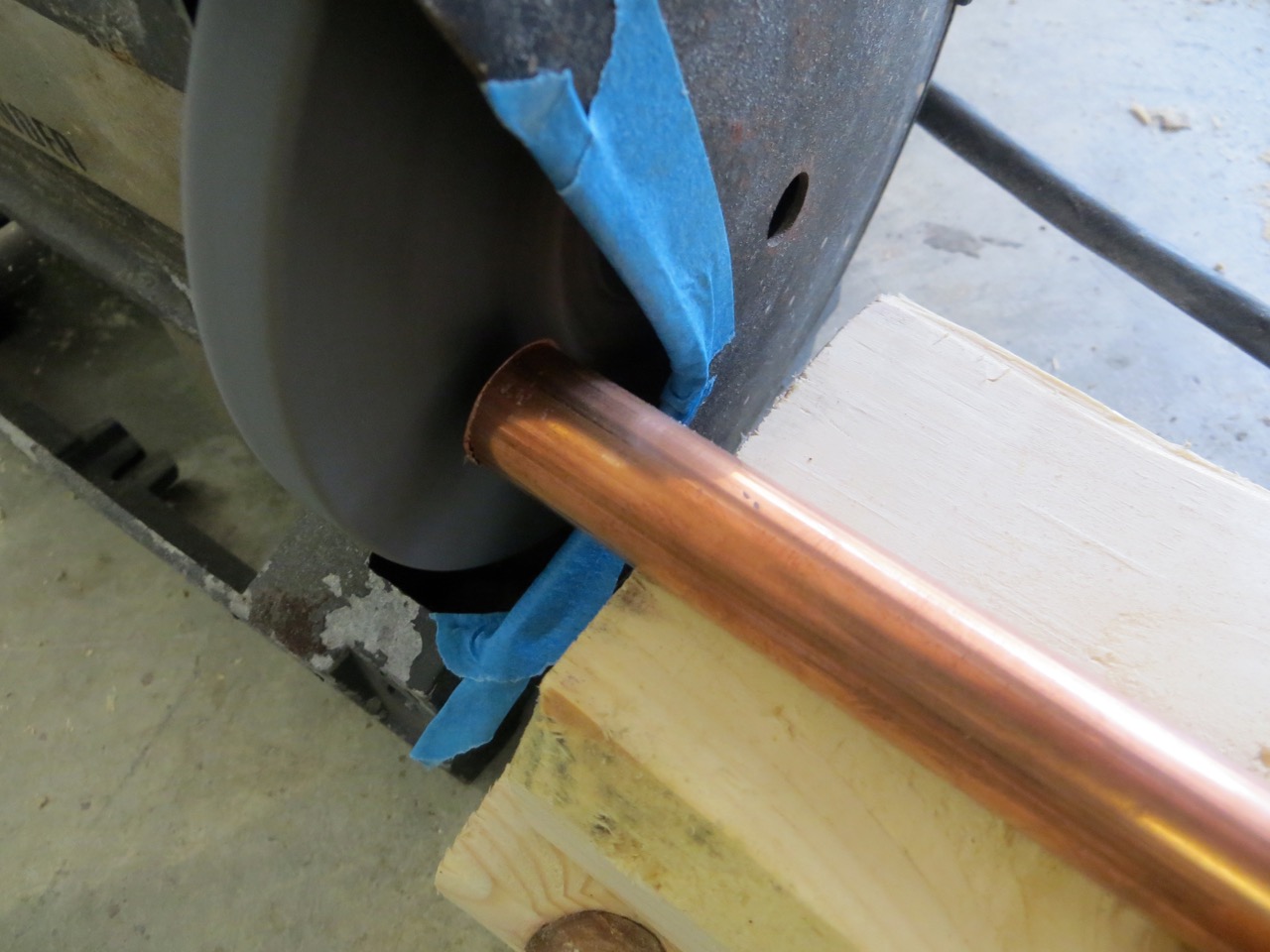 To fine-tune the length I first straightened one side up using my bench grinder. I used wood blocks for a steady surface and to keep the pipe straight.