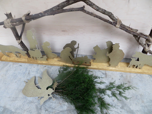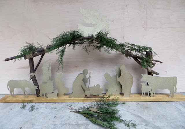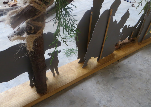 DIMENSIONS: The entire length of the base board for the nativity is 5-feet long and the branches reach 2-feet to the tip of the manger from the base. The total depth is 3.5-inches. TIP: Make your base whatever size you want but make your silhouettes first so you can build the manger around them.