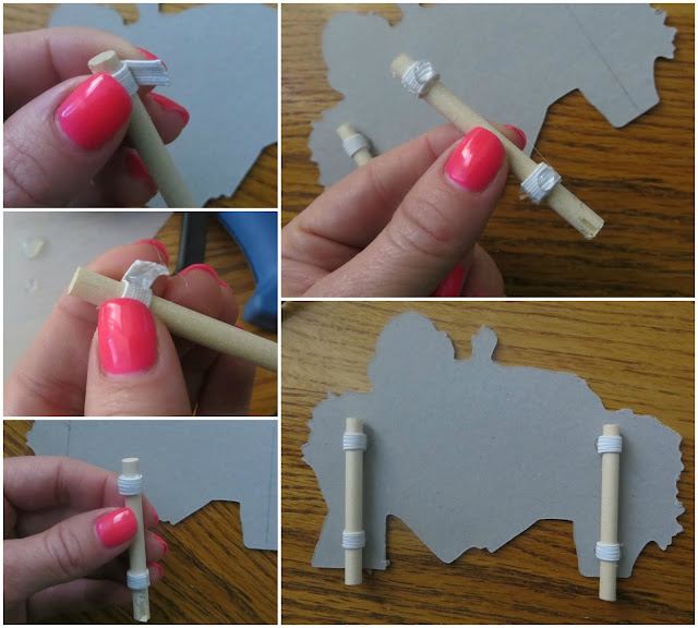 I preferred the option of removing my dowels so the silhouettes would store flat. I first glue 1″ pieces of elastic in a loop, using my dowel as a guage to ensure they’d be snug. I kept the loops on my dowels while gluing along the backs because it kept the loops in a perfect line. TIP: be careful you don’t get glue on your dowels!