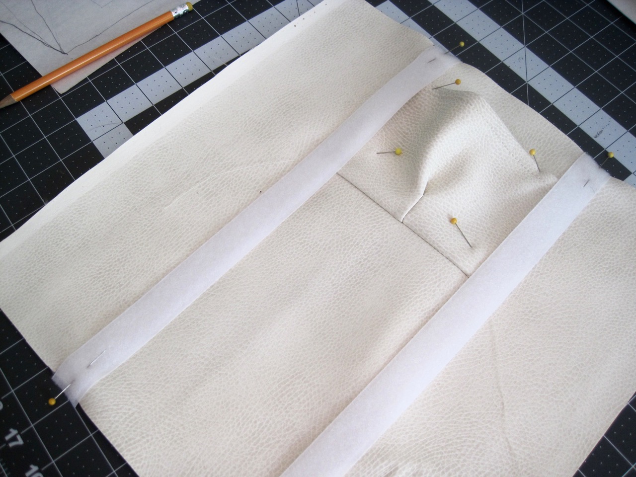 Place your pocket along the bottom side of the line you created, with the wrong side facing up and the pleat centered with your center mark.