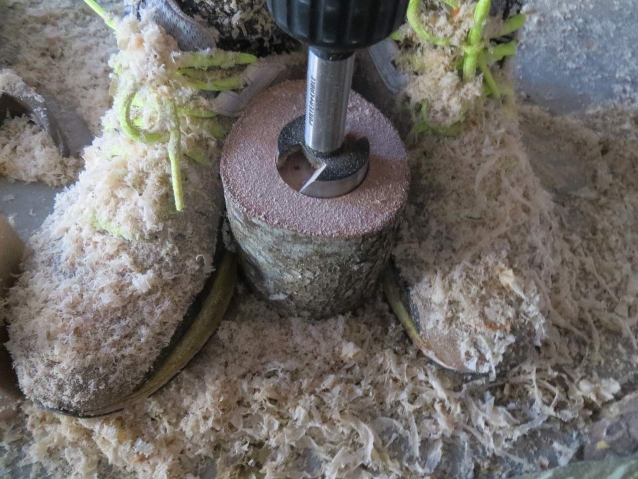 Most of my candles were 1-1/2″ in diameter but I had a few in small glass vases that had a 2″ diameter. I used forstner bits to drill the holes about 1/2″-deep. I held the wood with my feet so I could put a lot of downward pressure on the drill.