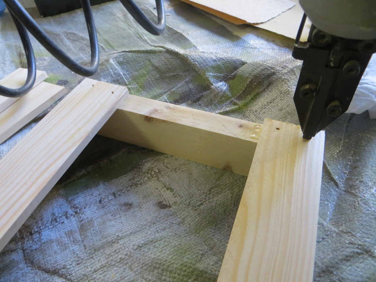 Attach your last 2 slats by gluing where they will over lap with the ends of your walls and space evenly between the other slats. Tack into place with a braid nailer.