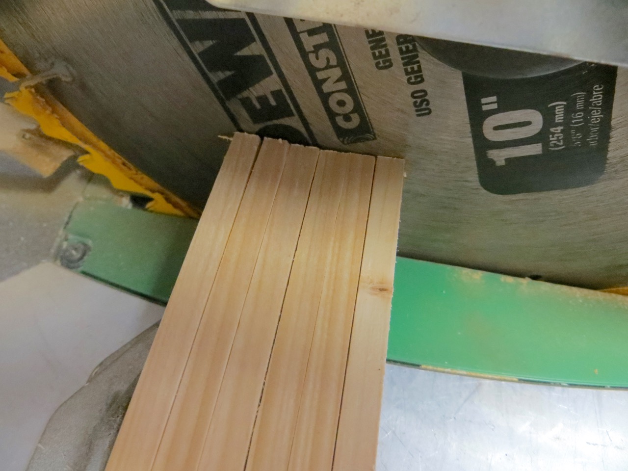 I lined up my 1/4″ strips together on the miter saw and took a hair off to clean and straighten up their ends; from those ends I measured 24″ and cut. You should have six 1/4″ strips that are 24″ long.