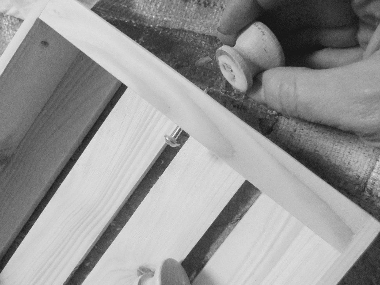 Drill your screw in from the inside so the tip is coming out of the end slightly. Rub glue on the base of your knob and put over the end of your screw. The screw aligns your knob just where it should be – then you can drill your screw in all the way. Wipe excess glue.