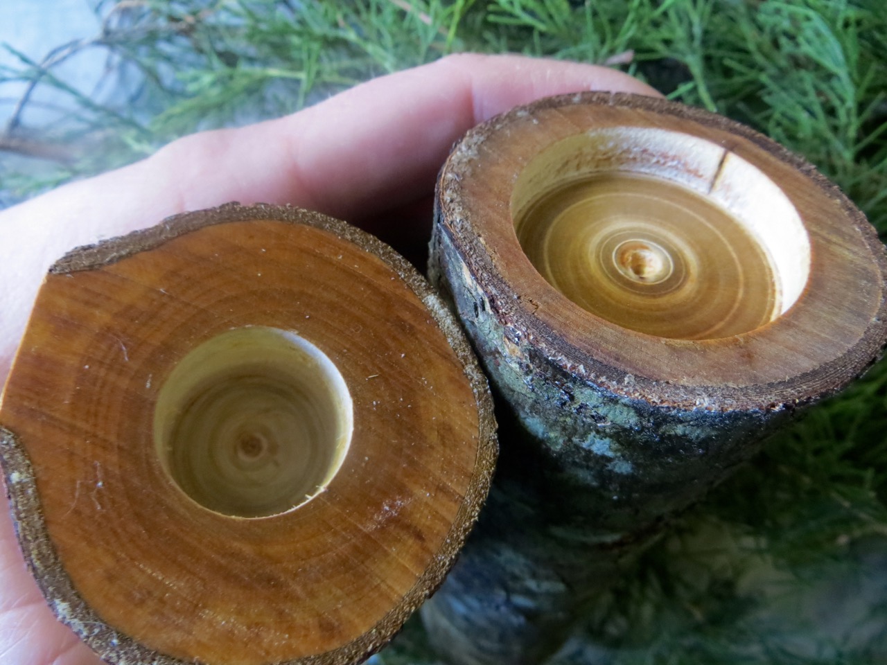 Living in North Carolina you’d think trees were weeds by how many cut down trees you see on the curb for free. Trunks, stumps, and branches galore! I decided to pick some thick branch pieces up one day and thought how they’d make awesome-chunky bases for candles (nothing new, I know… but they were free)! If you don’t have forests of trees surrounding you everywhere you go, perhaps you could visit the mountains or ask a neighbor for their yard waste.
