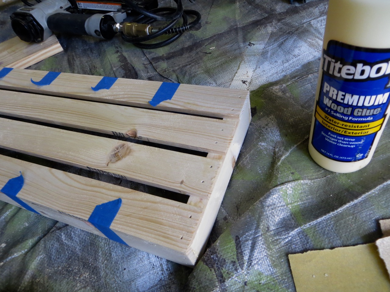 Tacking your 4 bottom slats on should be good enough to square up your tray before your side-walls dry. First you’ll be gluing the 2 side slats on the bottom or your tray. The side slats will be joined to the walls of your tray with only glue on the long sides because the walls are too narrow to nail into with the brad nailer – take care to glue well along the bottom edge of your side walls and over the end where your slats will overlap. Ensure the slats are flush with your walls and tack into place on the ends with a brad nailer. WARNING: Don’t hold your wood in the area you are nailing. Because the brad nails are so thin they bend easily with the grain and can turn and pop out of your wood where your fingers are!