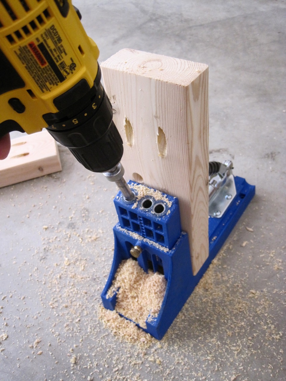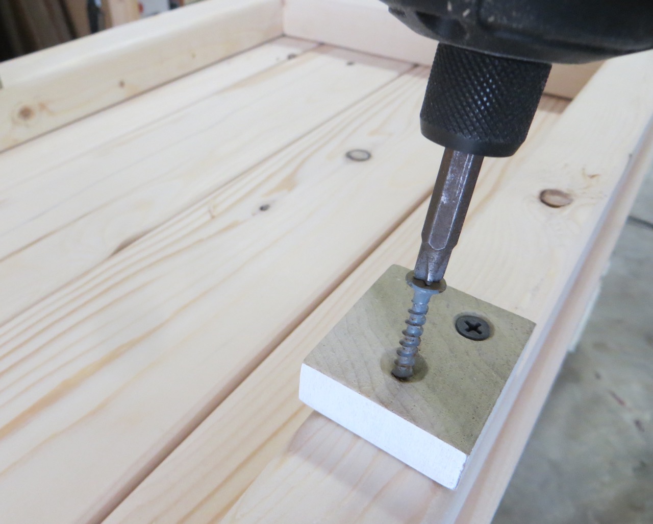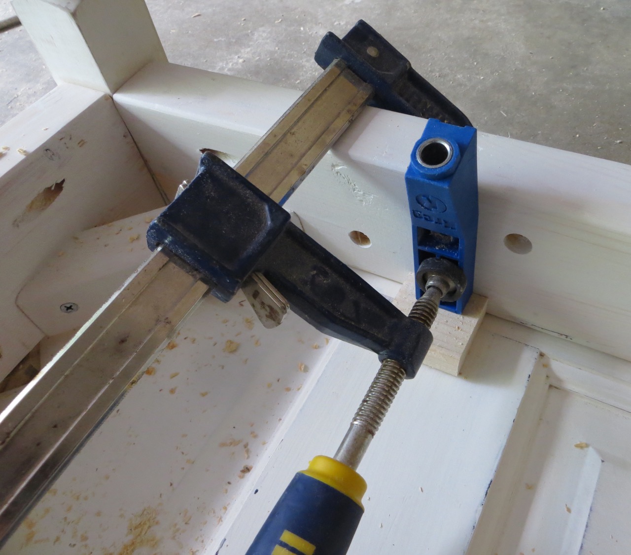 By this point I realized that my idea of attaching the door to the base through the corner braces wasn’t such a good idea after all because I’d need to use a spacer in-between because the panels weren’t flush with the entire door. If this is your case, I used my nifty little Kreg Jig thing (needed a spacer under it to get the right height for 2-1/2″ screws).