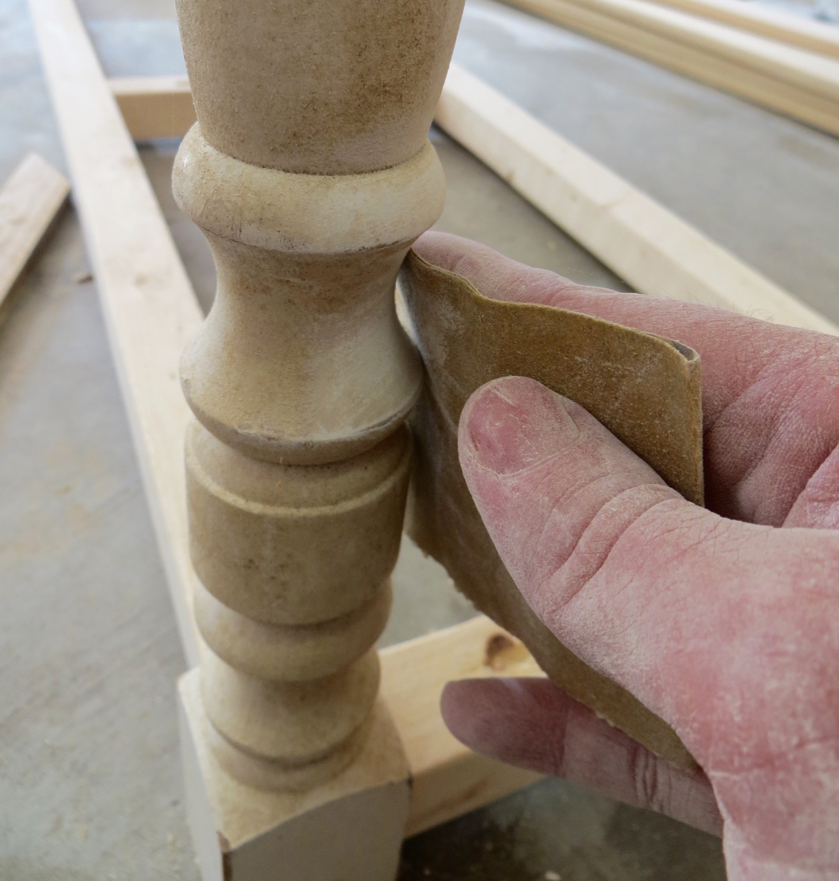 Lay out your 1×4 shelf boards over the shelf braces and mark where to cut your corners for the spindles. In my case, mine were a tad bigger than 1-3/4″. Sand the newly cut edges smooth. TIP: Consider how your boards will swell in humid-summer weather and make the cutout slightly bigger if needed.