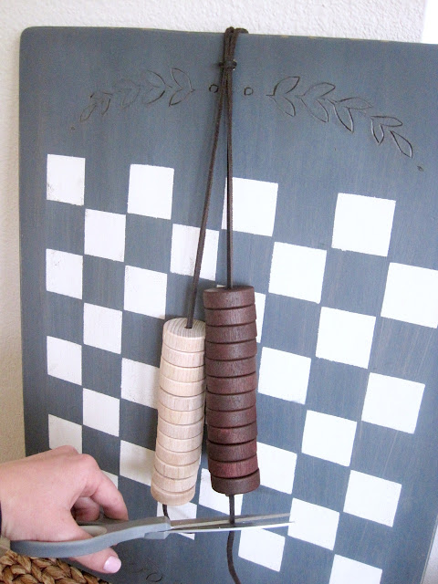 Fold your leather cord in half and stick the fold through the hole, starting from the back to the front. Pull cord ends through the loop and pull tight. Thread your checker pieces on and tie a single knot where you want your checker pieces to rest. Cut off excess cord.