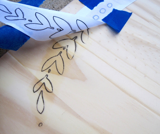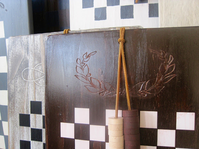 Wood-burned design, used “General Finishes” Brown Mahogany Stain, rubbed thinned-creme paint over design (to stand out), white vinyl squares