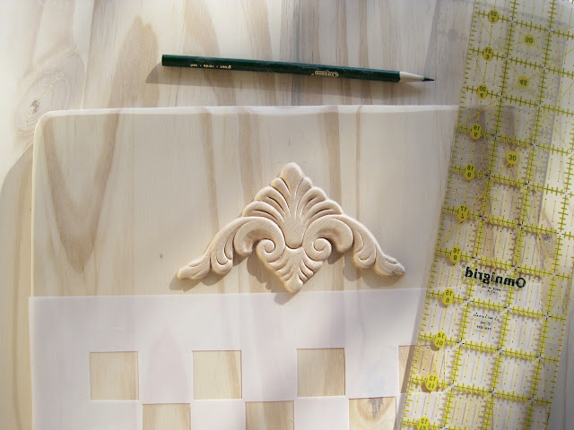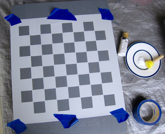 If painting your squares, use an Xacto knife to cut out squares from the template you downloaded. Center and tape template in place over your board.