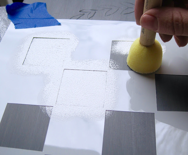 Using your sponge and craft paint, dab paint over open squares. TIP: don’t put too much paint on sponge or it can seep under template easily.