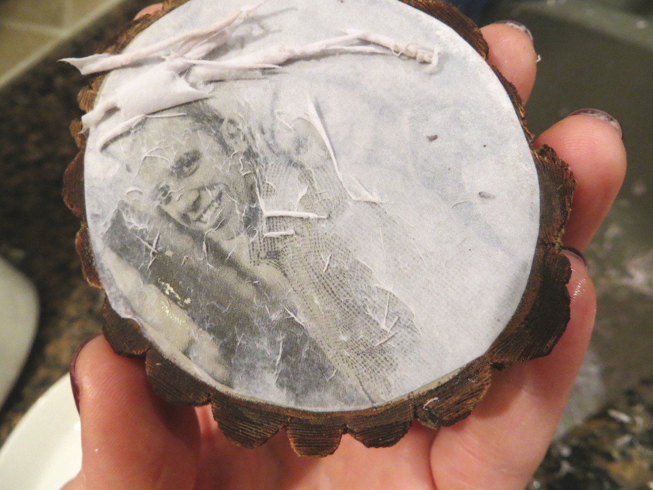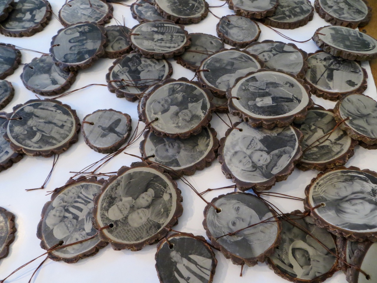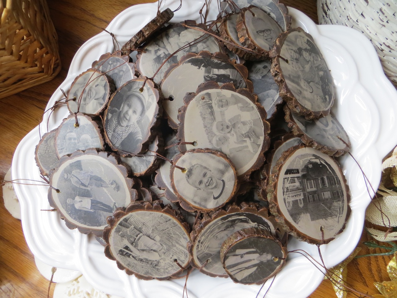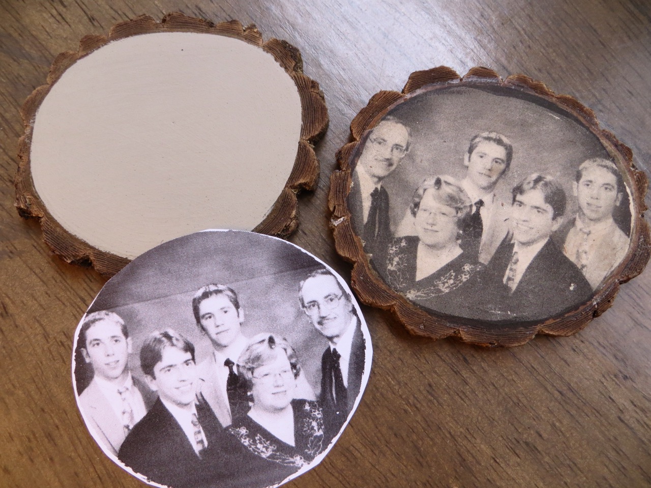 I’m going to show you how you can transfer photographs/images onto wood* slices for making your own ornaments. Because we live so far from family I really wanted to have ornaments that sparked memories for the kids. I probably overdid it by how many photographs I chose but I couldn’t help it! I made sure we had Grandparents, Great-Grandparents, Cousins and Aunts/Uncles of the kids’ to display along with pictures of our own little family. The kids love the ornaments and I catch them looking at them all the time.