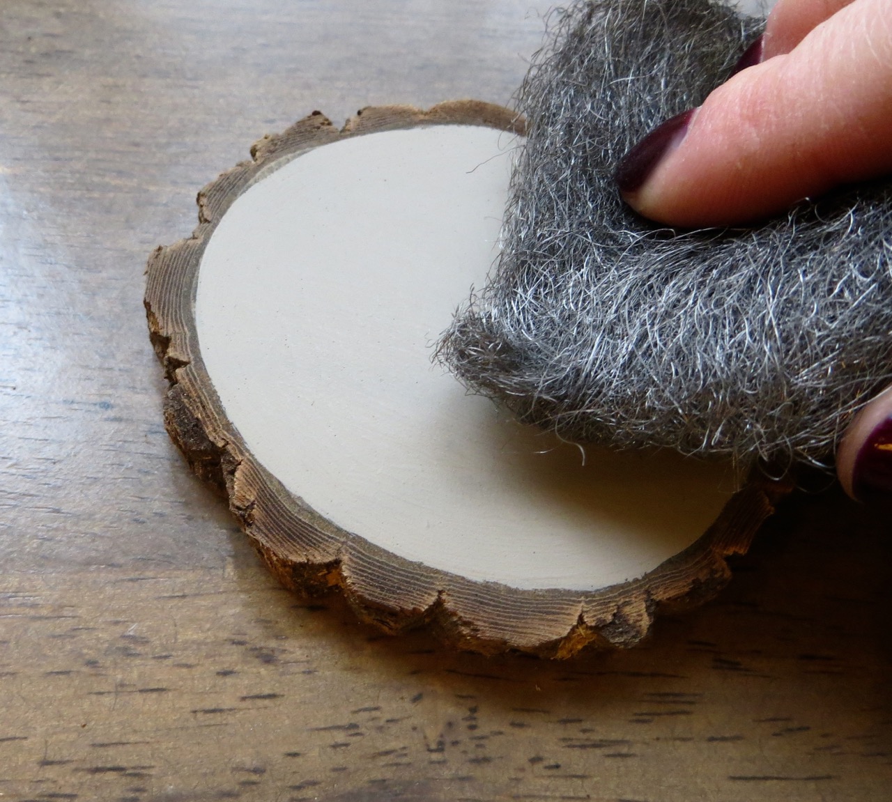 Lightly sand smooth with 220+ grit paper or 0000 Steel Wool. TIP: it may be tempting to skip the sanding but don’t – it will give your ornaments a nice-smooth feel! This first layer seals any remaining paper fibers so the last coat will be perfectly smooth.