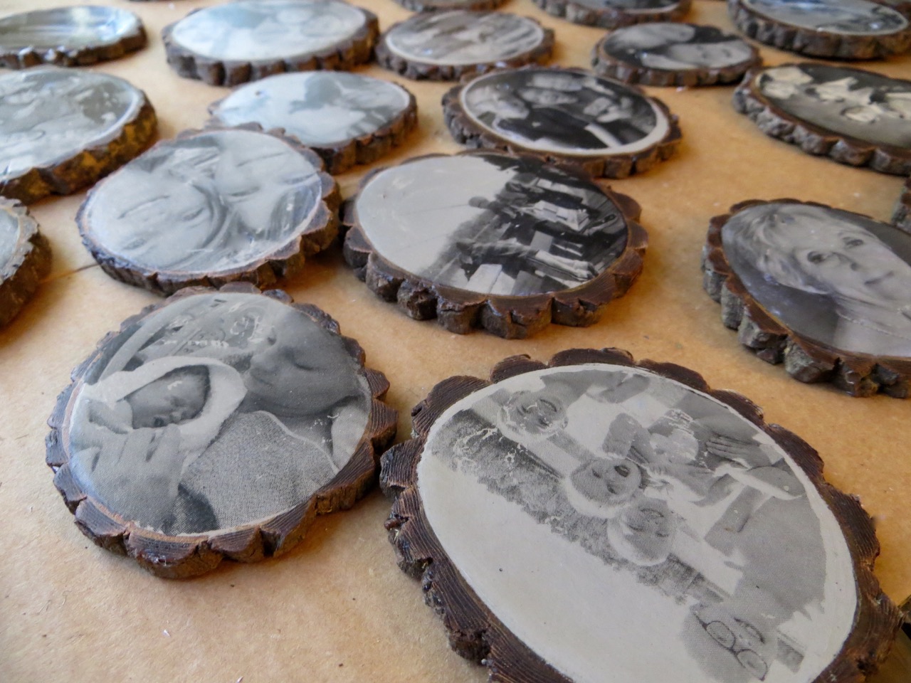 Because I had a few sizes for my wood slices I made different shape sizes to clip my various pictures. For groups of people I used larger shapes and head shots were smaller.