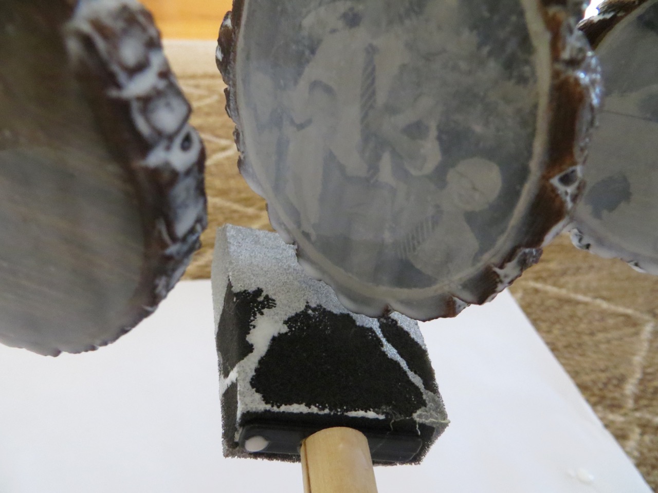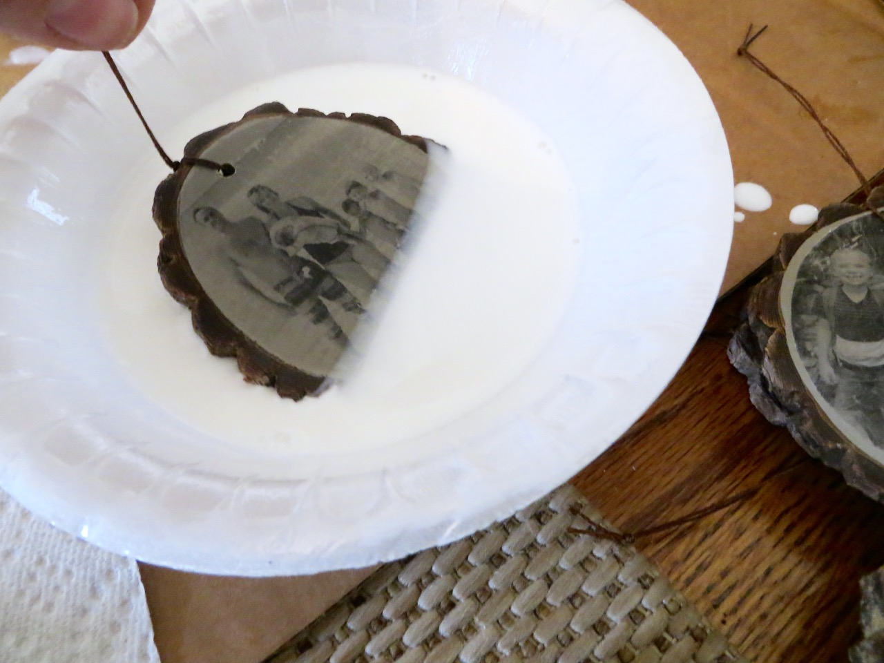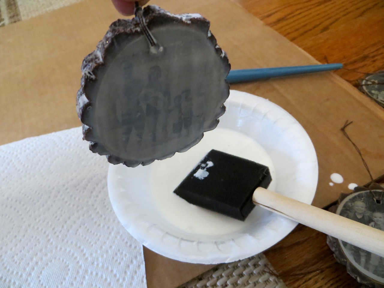 Periodically dab the bottom of your hanging ornaments with your foam brush to absorb any Modge Podge that is pooling/dripping along the bottom.