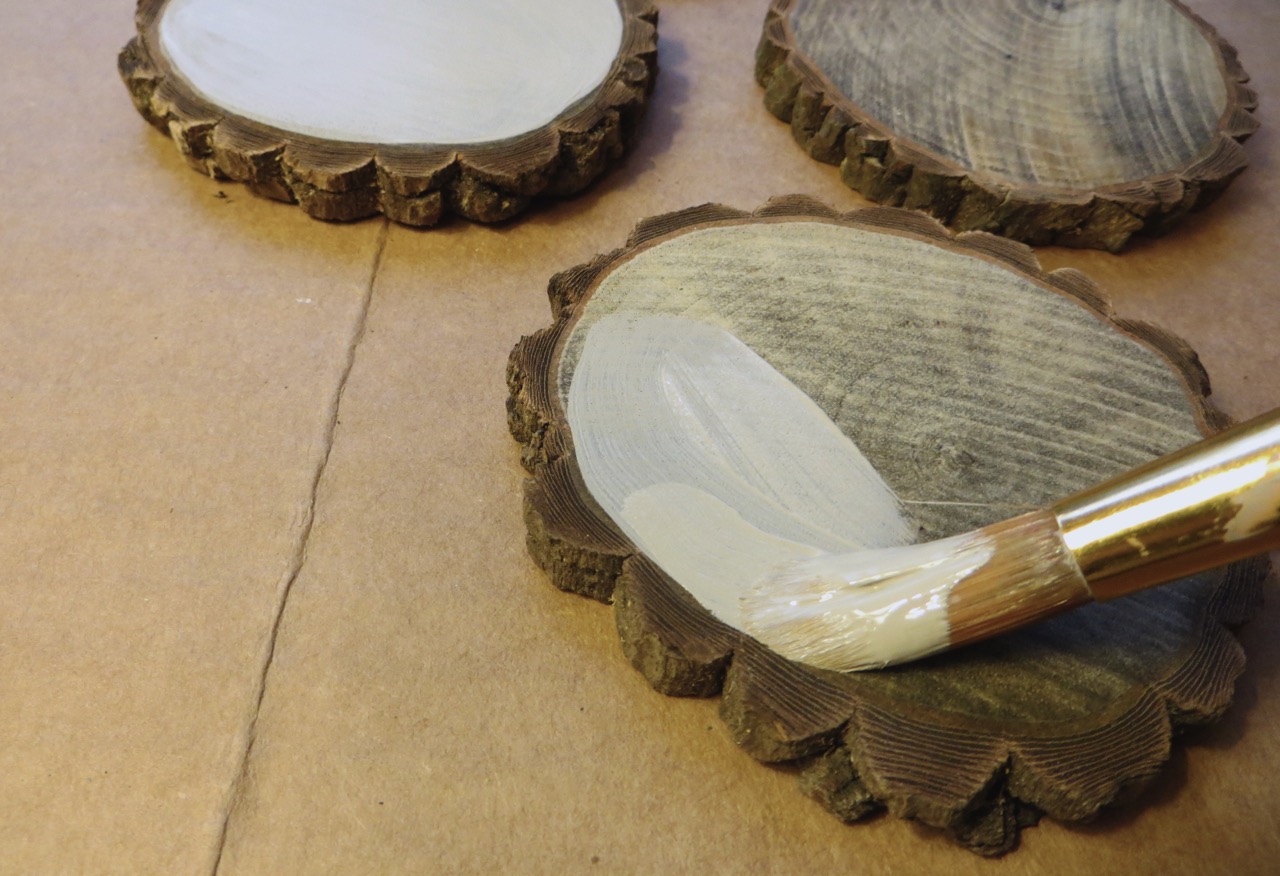 Paint the top side of your wood pieces with your light-colored paint. I chose a light taupe because I didn’t like the stark contrast that white created (I did a test ornament to discover this). Let dry and do a second coat.