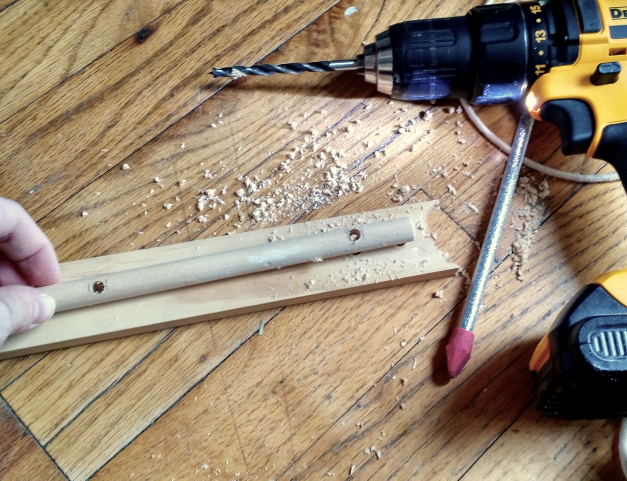Drill a hole in the center of your marks, making sure they’re all centered together. I used a 1/4″ bit since my rope is 1/4″ thick.
