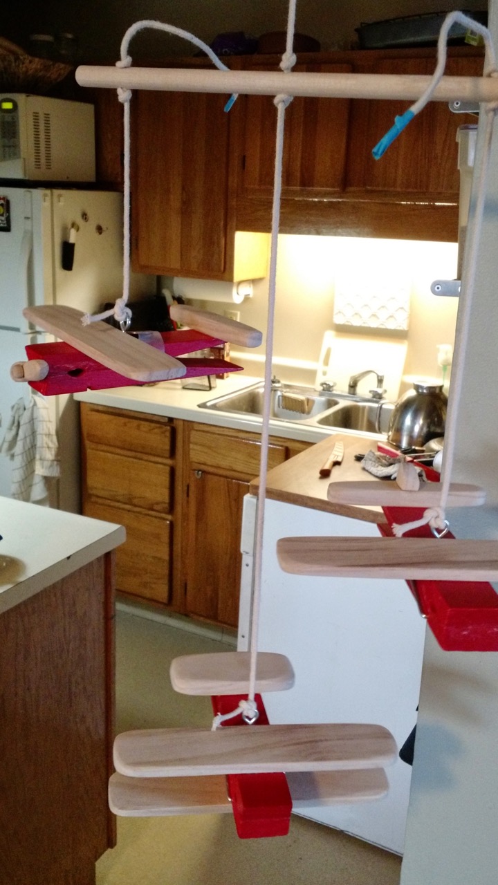Here’s my mobile with ropes going through the holes in the dowel, knots tied on each side of the dowel and I have at least 7″ of extra rope on each of the end ropes.