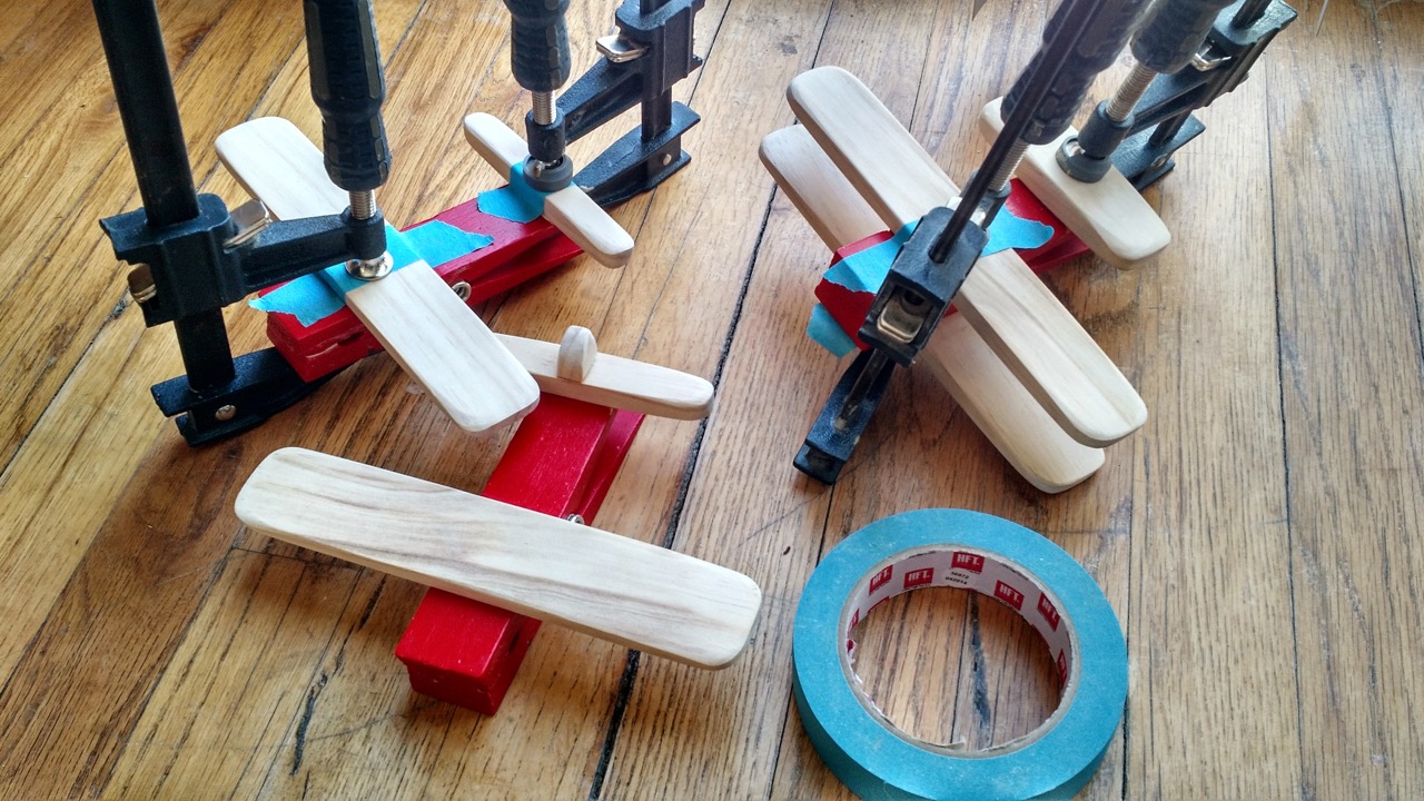 Use masking tape to hold pieces in place temporarily while you clamp. If you only have 2 clamps… do 1 airplane at a time.