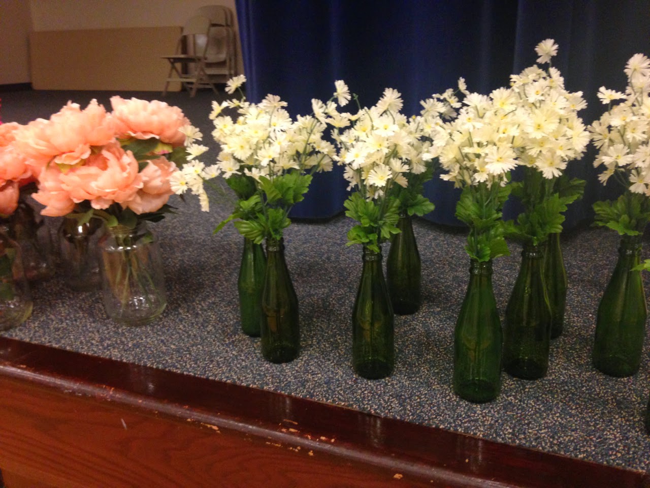 For the small white flowers (little daisies?) I found mini Martinelli drinks and I loved the green glass. It ended up being a win-win because my family got to drink the drinks and we got cool vases out of the deal for the event! I put 2 of these together on the table so we had 10 total.