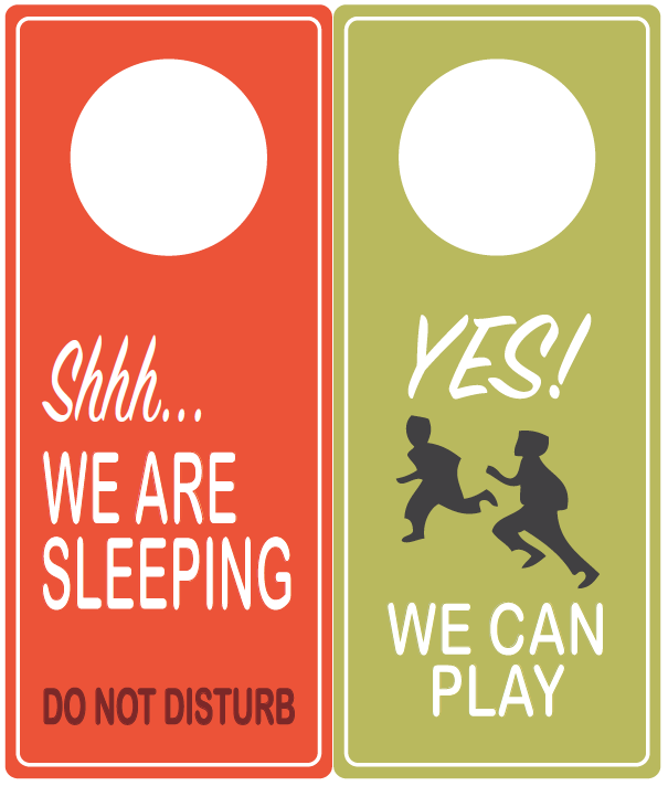 I made a door hanger to put on our front door… it’s simple and easy to understand for the neighborhood kids with a “YES! We can Play” side and “Shhh… We Are Sleeping – DO NOT DISTURB” side.