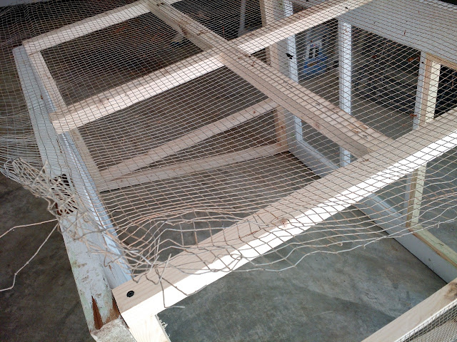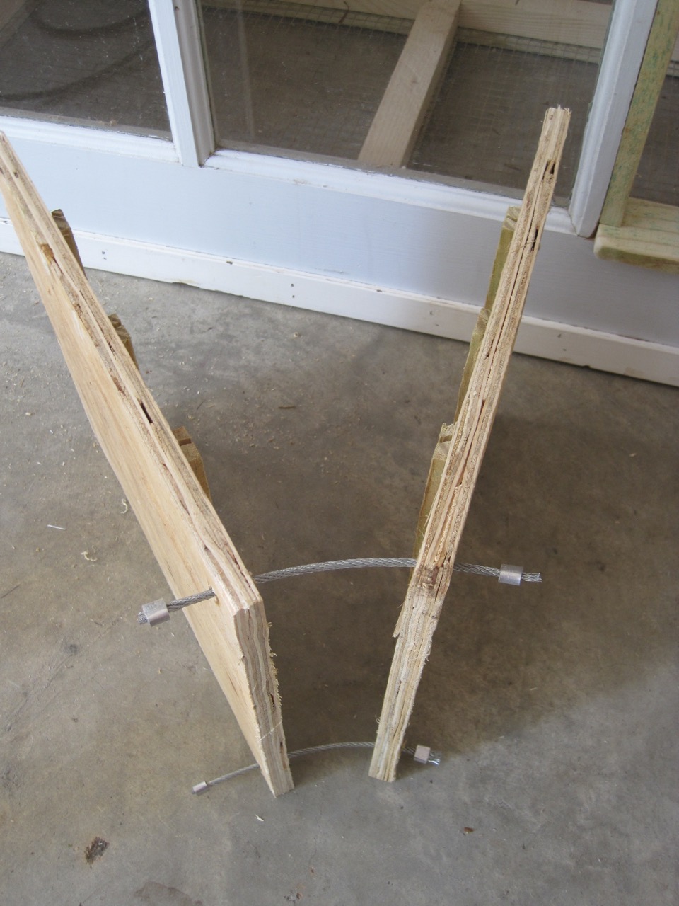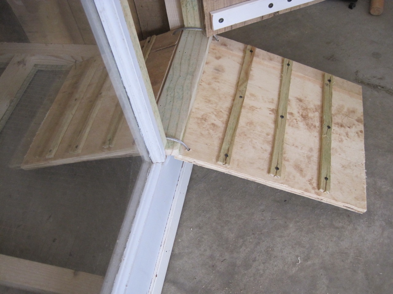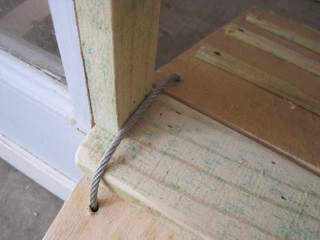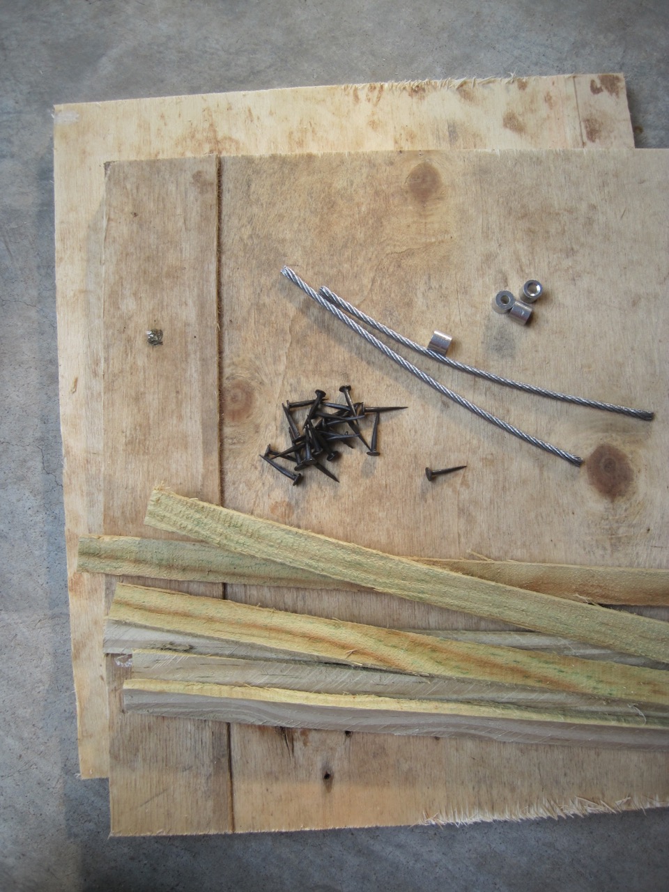 Now the little ramp.  I gathered supplies such as galvanized wire rope, wire stops, nails, plywood and trim.  I glued/hammered trim pieces over my plywood for traction.