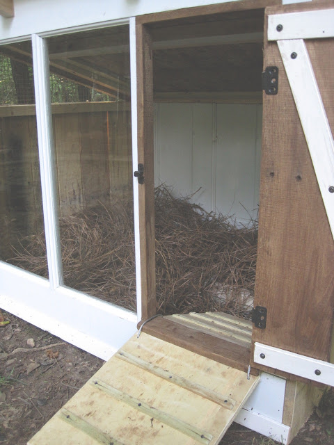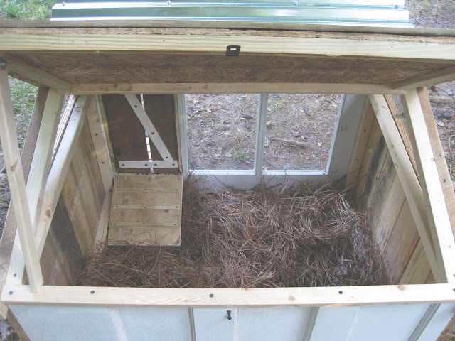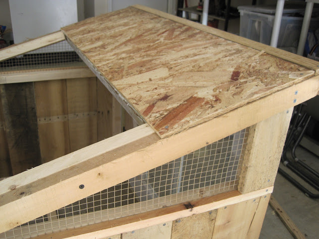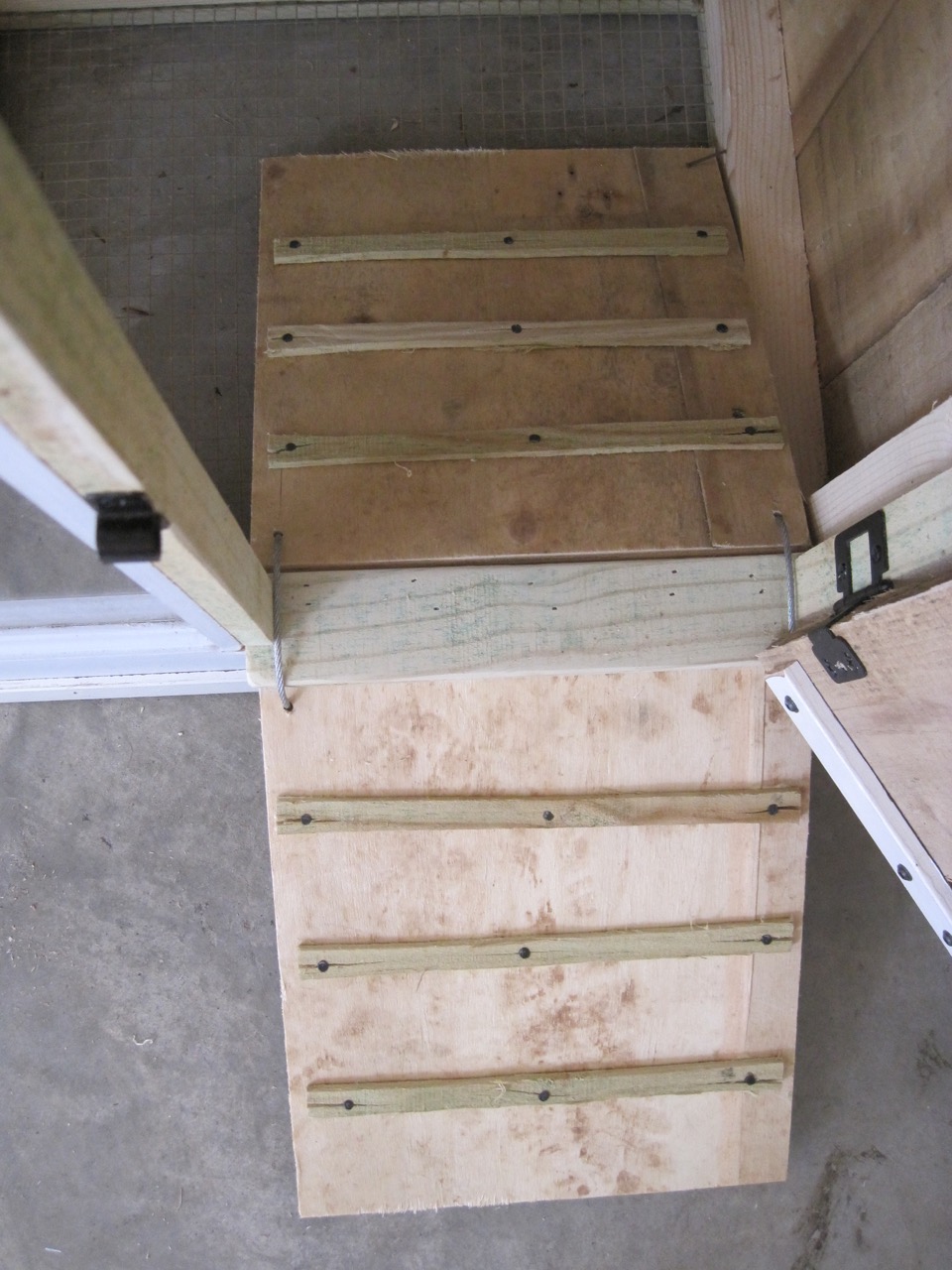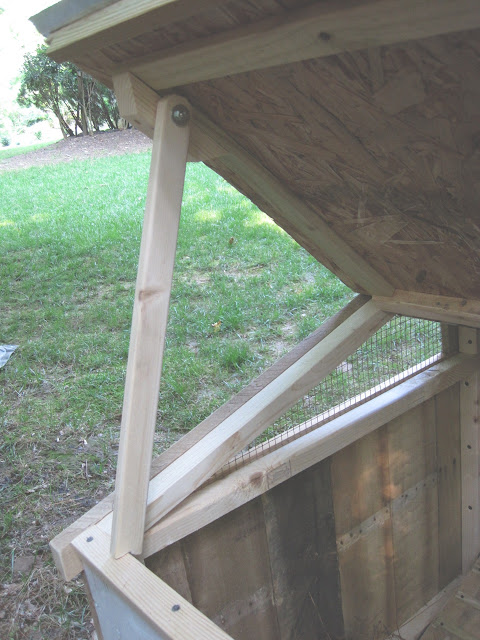 The last thing I did was attach a block on the roof trim so I could put a long bolt through to a wooden arm that swings down and holds the roof up for gathering eggs and cleaning out the house (so handy)!