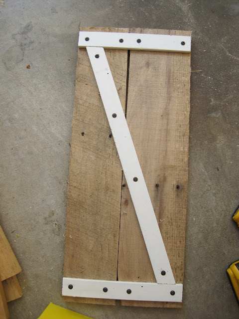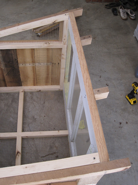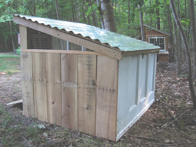 I knew I wanted something small, easy to make and to take advantage of materials I already had.  I looked around at what I had and that largely influence the overall shape/design.  The main piece was a large-old white door with a broken window pane – then I had a really heavy-long pallet, a few dog-ear fence pickets, a 2×6, an old plywood piece, many scraps of wood and used hardware clothe and metal roofing from the chicken coop build.  Much of this was outside by our shed making a mess of our yard or in the garage taking up space.  After completing the house I appreciated all the little scraps I saved from previous projects – it was awesome to just dig around and find what I needed.  The only items I had to buy was a set of hinges, 2 door clasps and an extra piece of metal roofing… then buy more screws to add to my supply for the next projects! 🙂