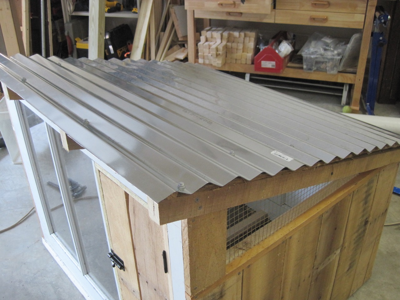 It took me a while to figure out how to make the roof hinge AND be waterproof.  Luckily my scrap roofing was just the right size for the bottom section and I could see that it would hinge nicely with the bend on the end.  I screwed it on with gasket screws.