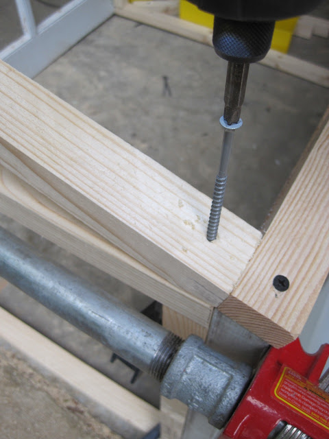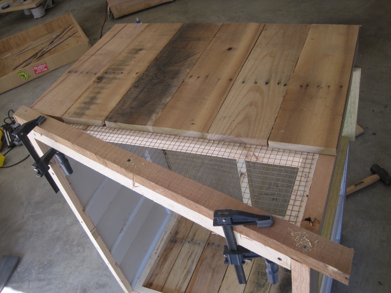 I cut the boards the right length, still giving me some room to add a trim piece along their ends to cover.  I used one of the 2×4’s from the pallet and cut in half for the top of the sides which you see clamped.  I used long screws to attach these because they are like ‘handles’ for moving the house if needed.