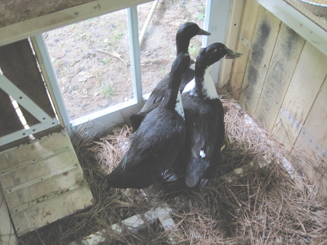 The duck house came into play when I realized they probably weren’t best off with the chickens in their coop laying right under where they roost (poop)… plus they were making it so the ‘deep litter’ method was pretty much impossible.  The ducks love to be with the chickens like they were meant to be together but the chickens peck at the ducks and don’t let them eat their food.