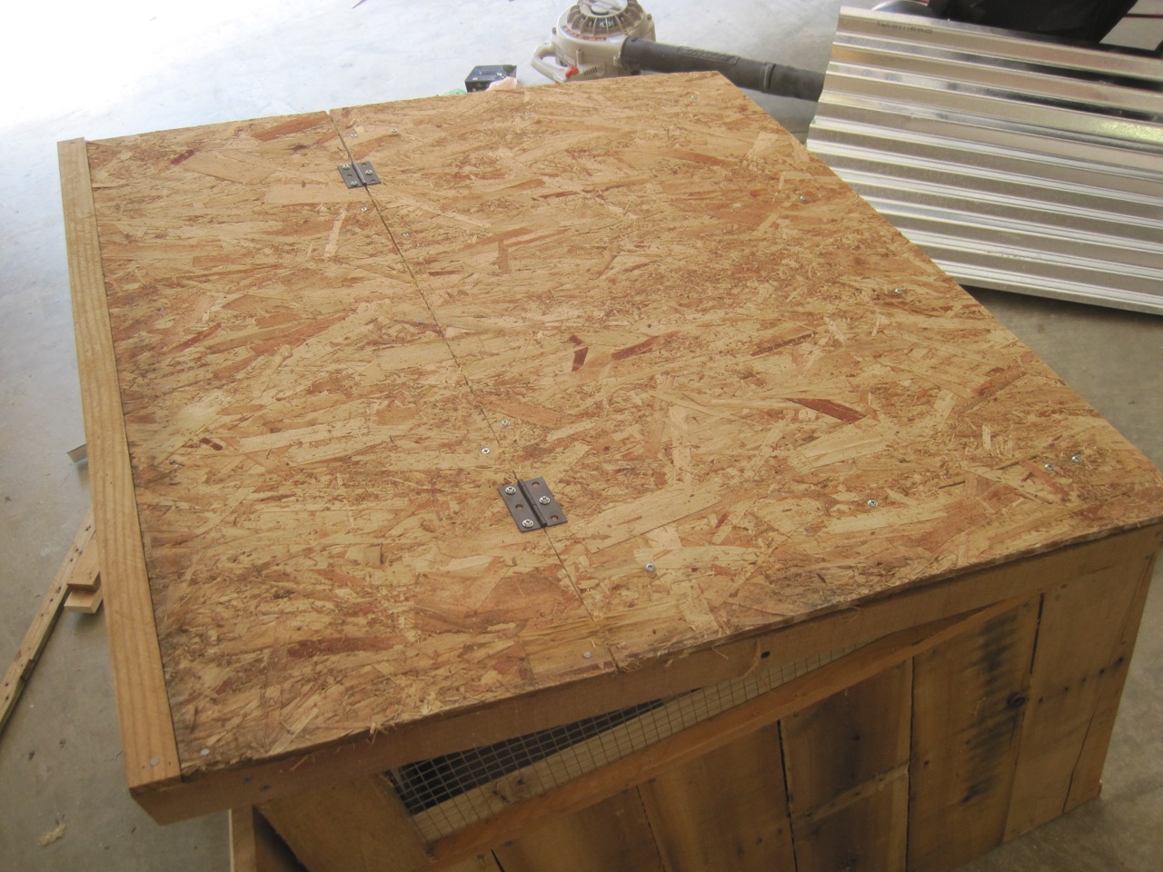 It took me a while to figure out how to make the roof hinge AND be waterproof. Luckily my scrap roofing was just the right size for the bottom section and I could see that it would hinge nicely with the bend on the end. I screwed it on with gasket screws.