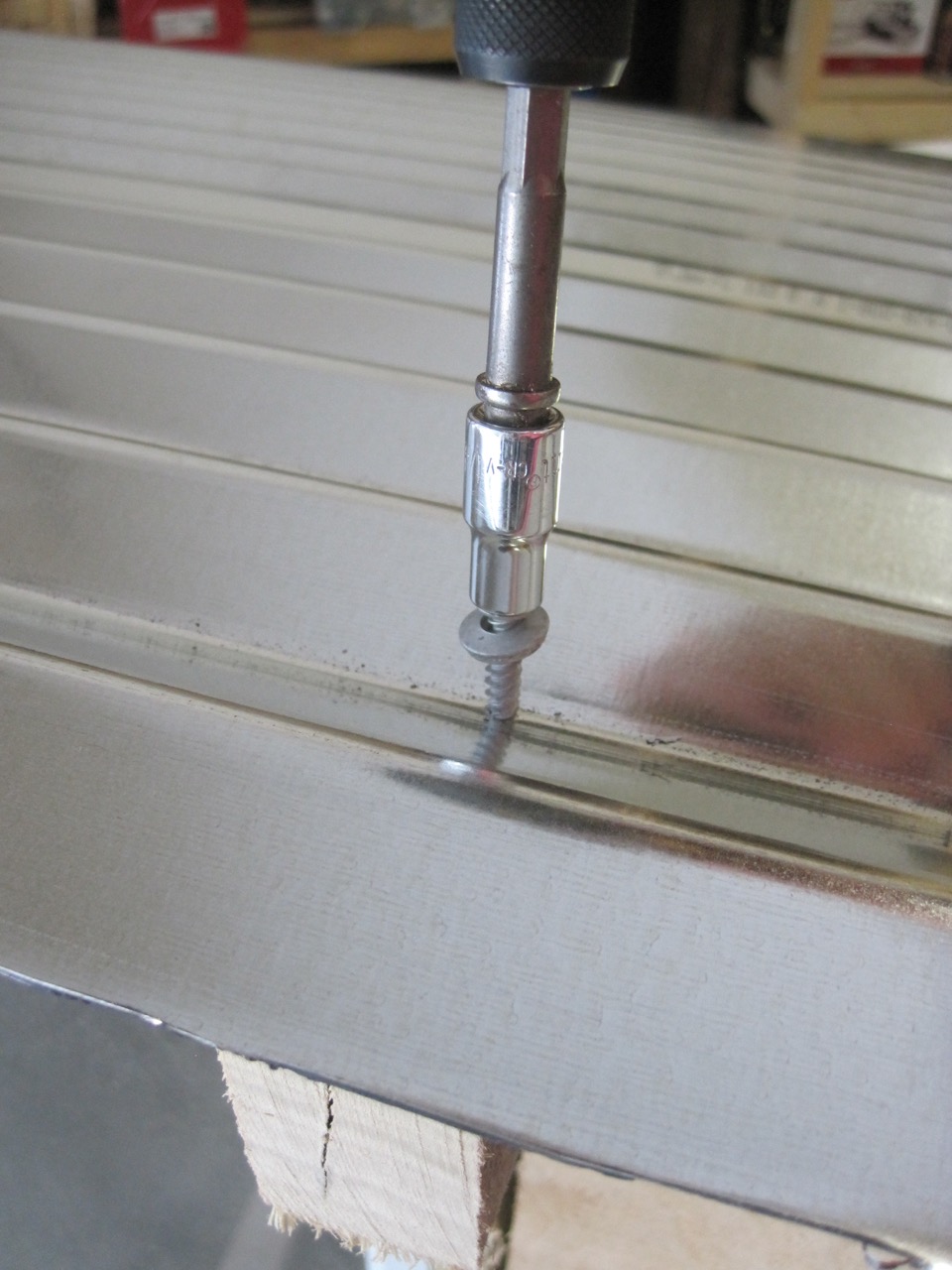 It took me a while to figure out how to make the roof hinge AND be waterproof.  Luckily my scrap roofing was just the right size for the bottom section and I could see that it would hinge nicely with the bend on the end.  I screwed it on with gasket screws.