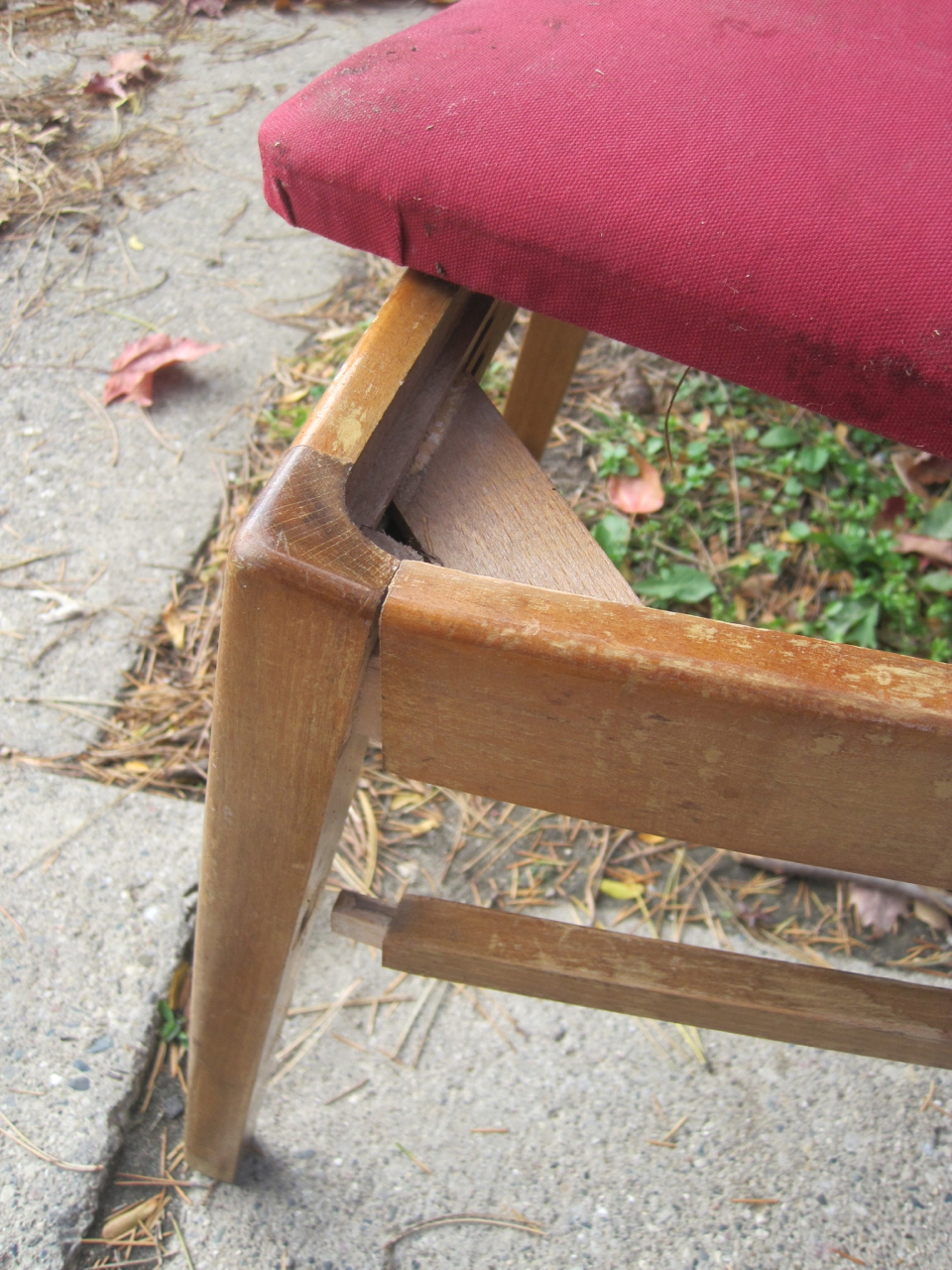 Okay, I can believe it. Look how it’s barely holding onto life. The style is cute, it’s hardwood, and once I turned over the cushion and saw the springs I just had to do something. Springs in a chair cushion.. amazing! And yes, I dug this thing out of the dumpster with my shovel.. a little embarrassing but I was determined to save it’s life.