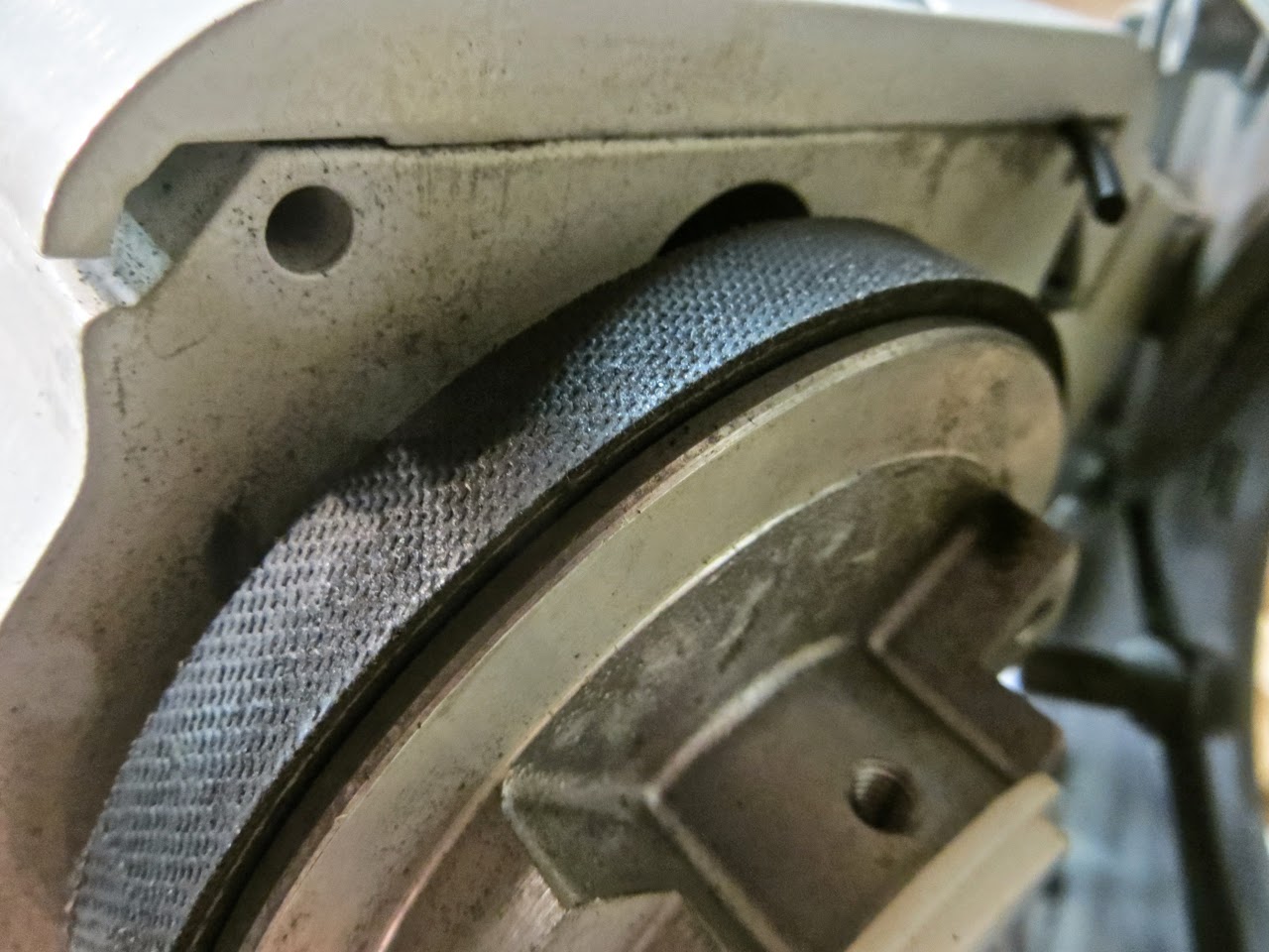 Next was tackling the belt problem and solving the rubbing noise. Upon inspection the belt was so wide that it wasn’t riding down into the groove around the hand wheel far enough…