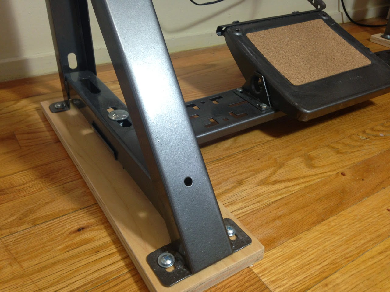 …so I screwed some plywood “skies” to each leg. I also glued on a new cork pad on the pedal since I scrapped the old one off to paint (and it was nasty, of course).