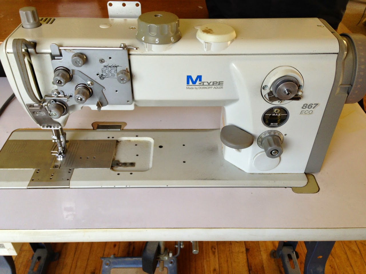 My quest for the perfect industrial sewing machine ended when I found an Adler 867 on Craigslist. It is classified as a triple compound walking foot machine meant for Upholstery. Triple compound means it has a regular presser foot and a walking foot, PLUS the needle & feed dog move forward/backwards together while stitching – it is the best way to ensure your stitches are even and uniform for thick projects. The machine is pretty fancy too with because it is self-lubricating – you fill up a “tank” with machine oil and it is distributed to different areas of the machine using a wick system making it pretty much maintenance free (except for routine cleaning).