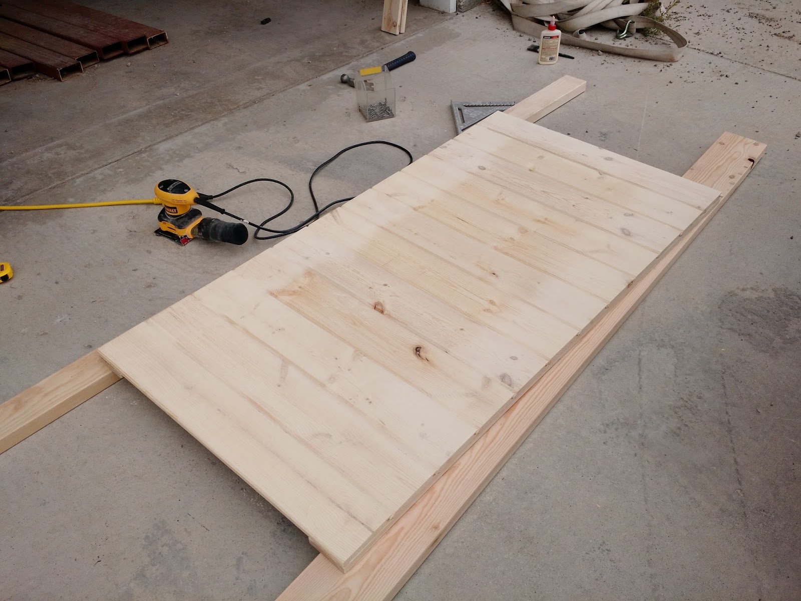 After cutting your wood, sand everything with 100, 120 & 150 grit paper. Layout your TG boards to create your panel. Once they are together, each board has a finished measurement of 5″ wide. You will need to cut the tongue off the last board using a table saw.