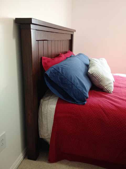 While visiting my family in Utah my mom was trying to decide how to make the guest room look better. I immediately told her “I’ll make you a headboard!” I’ve had my eye on the farmhouse style bed plan from the Ana White website and was excited to try it out. I didn’t make the whole bed frame, plus I made a few tweaks of my own and will highlight them below. For the wood I spent about $65 and another $40 for Stain and Polyurethane.